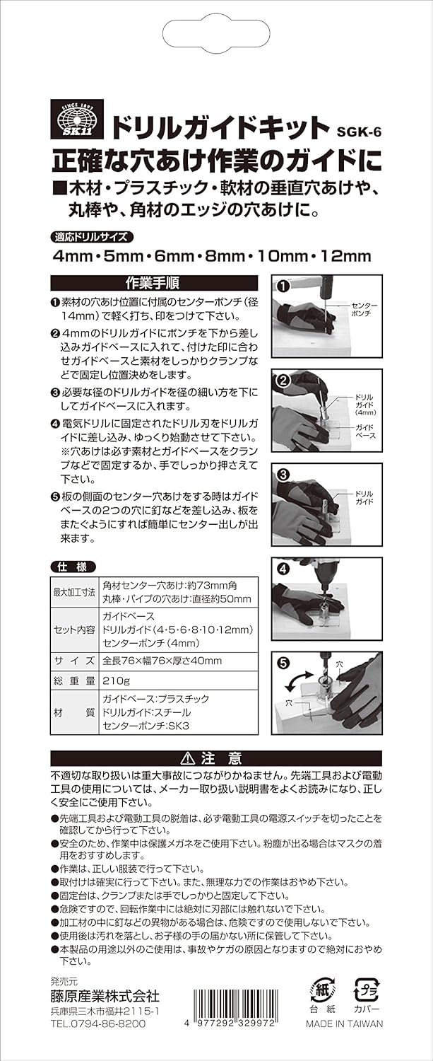 • セット内容:ガイドベース・ドリルガイド(4・5・6・8・10・12mm)・センターポンチ(4mm)