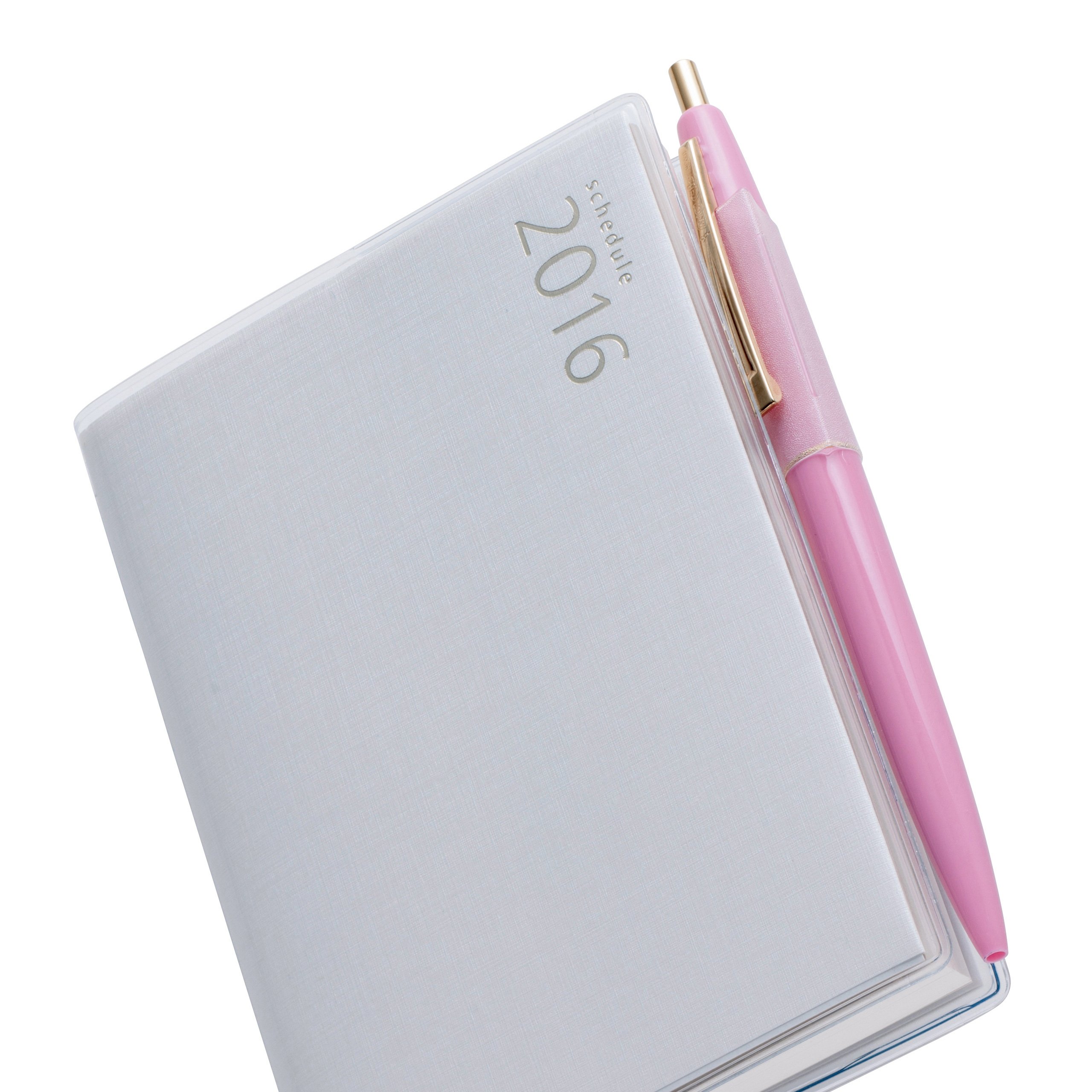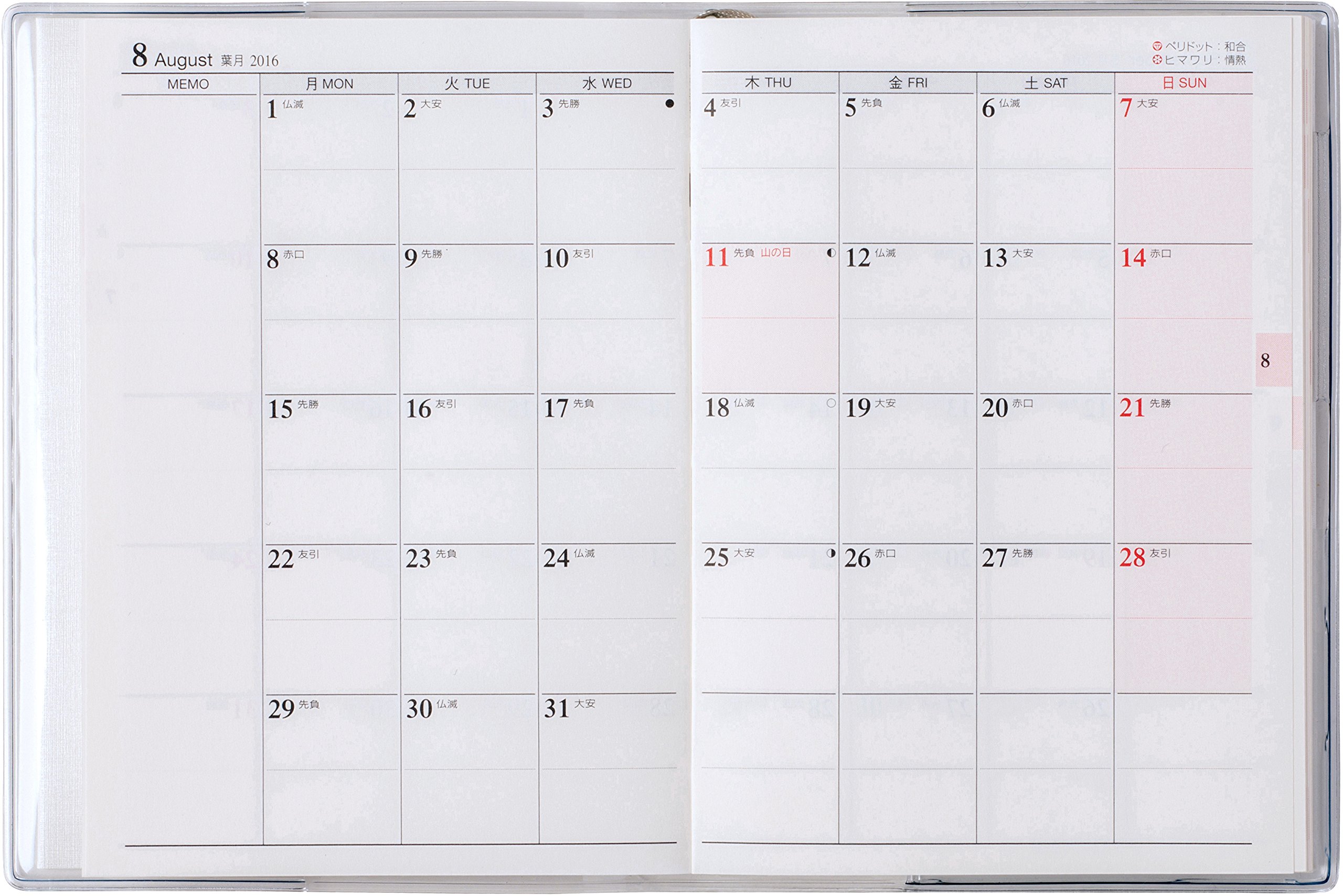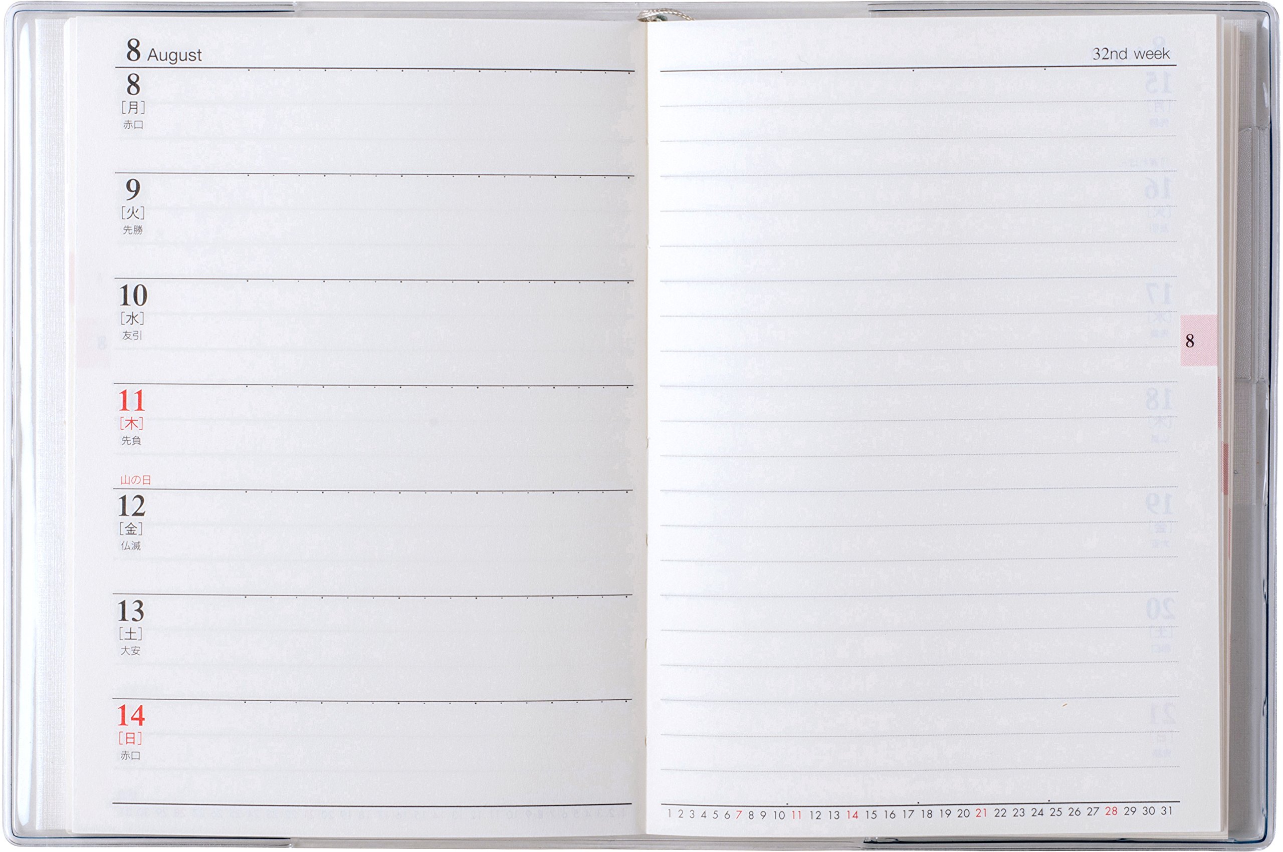 The left page is a schedule section for one week, the right page is free sideways keimemo.