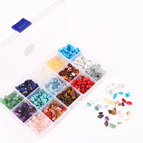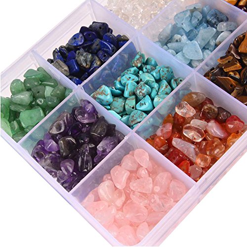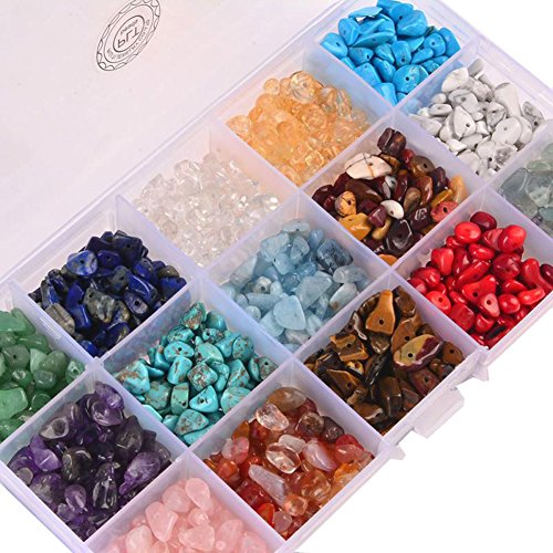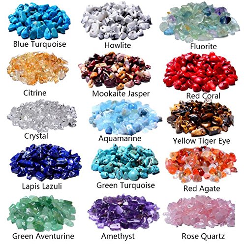 - Gemstone: 15 Different Type Genuine Natural Semi-Precious Gemstones Chips Beads Green Aventurine,Lapis Lazuli ,Crystal,Citrine,Blue Turquoise,Amethyst,Green Turquoise ,Aquamarine,Mookaite Jasper,Howlite,Rose Quartz,Red Agate,Yellow Tiger Eye,Red Coral,Fluorite.