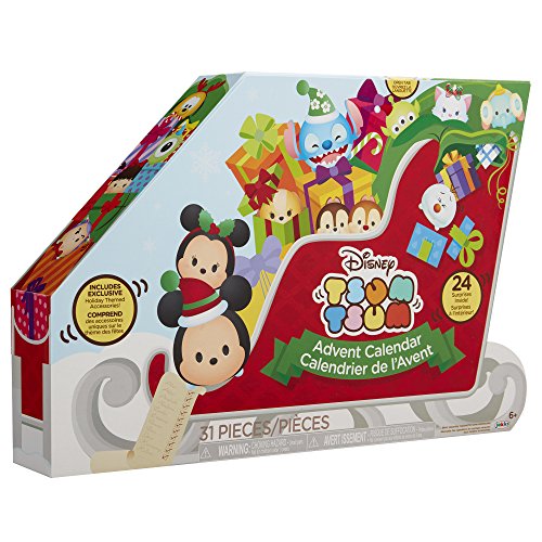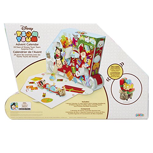 Enjoy counting down the 24 days until Christmas with the Disney Tsum Tsum Countdown to Christmas Advent Calendar. Open a new window each day to reveal a surprise Tsum Tsum figure or accessory and create a fun winter ski slopes themed scene. There are 18 Tsum Tsum figures, 6 large, 6 medium and 6 small in holiday attire as well as 6 holiday themed accessories, and 6 seasonal head pieces in a winter ski slopes themed package. Each holiday accessory is stackable and can be used to stack a large, medium & small Tsum Tsum figure on its own or used to build out an even taller stack with other accessories! Head pieces fit on each large Tsum Tsum figure for the perfect holiday decoration. Collect, stack and display your favorite holiday themed Disney Tsum Tsum characters! Some assembly may be required. Ages 6+.Feature