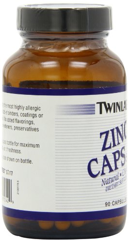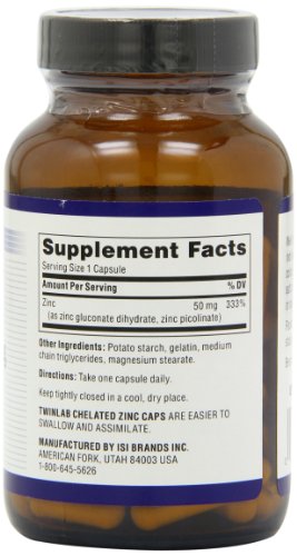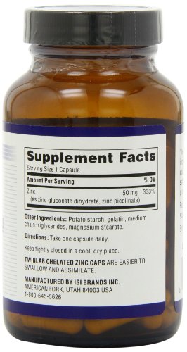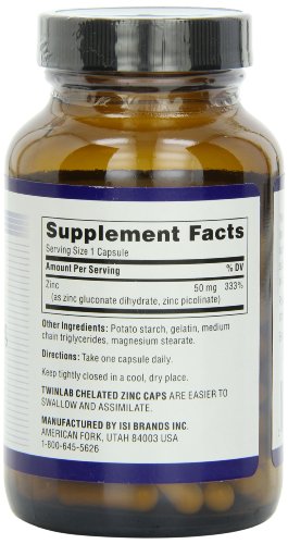 Studio : Twin Lab Publisher : Twin Lab Binding : Health and Beauty Product Description Natural - Chelated Well tolerated by most highly allergic individuals. Twinlab Chelated Zinc Caps are easier to swallow and assimilate. Supplement Facts Serving Size: 1 Capsules Servings per Container: 90 Amount Per Serving % Daily Value Zinc (from zinc gluconate dihydrate, zinc picolinate) 50 Milligrams 333% Other Ingredients: Potato Starch, Gelatin, Purified Water, MCT, Magnesium Stearate. Free Of most common allergens such as corn, soy, yeast, rice, barley, wheat, lactose (milk sugar) and all milk, citrus, fish and egg products. No added flavorings, sugars, salt, artificial sweeteners, colorings, preservatives or salicylates. Directions As a dietary supplement, one capsule daily. 0