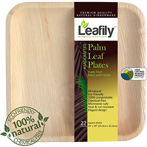 Leafily Palm Leaf Plates - 10 inch Square - Heavy Duty - Elegant - 100% Compostable - Better than Bamboo or Wood - Disposable - Biodegradable - Premium Party Plates - USDA Certified - 22 Count