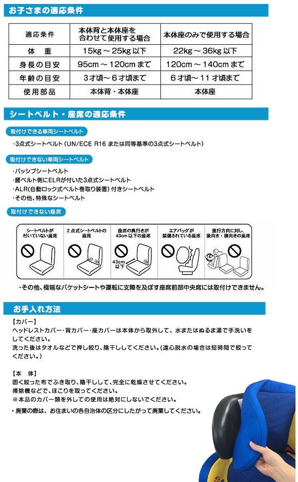 | 仕様 | ECE(欧州安全基準)R44/04 汎用型グループII・III 【適応条件】 ・体重:15kg以上~36kg未満 ・身長(目安):95~140cm ・年齢(目安):3才~11才頃 ・腰が安定し、1人座りができること。 |