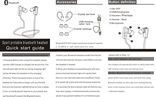 -. Feature : Imported CSR Bluetooth 4.0 + EDR chip, it can be used to call / stereo Listen to music.smart devices tailored style full of dynamic fashion, by chasing sticks outdoor rider, skateboarding people. / Have rapid audio transmission speed, music, talk, radio, the game as one of the all-round high fidelity experience. / With a tailored ColorCore, EarGels medical crystal earmuffs. Random equipped with three sets of L, M and Small crystal earmuffs. / Operating Range: Up to 10 meters£» Music playback time: about 5-7 hours£» Talk time: about 6-8 hours£»Standby time: about 180 hours£» Charging time: about 2-3 hours. / USPS Tracking mail,Delivery time 7-15 business days.1 Year Warranty.