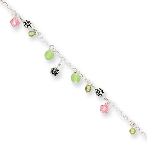 What's not to love about this multi-colored dangling anklet featuring pink crystals, genuine peridot and green quartz beads with antiqued rope circle charms? It is fashioned from sterling silver, measures 9-inches in length and fastens with the spring ring clasp. The color range varies on all genuine stones so please allow for slight variations in shades. Gemstone treatment: not enhanced.Feature