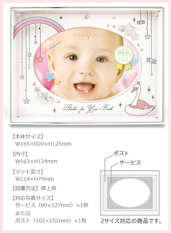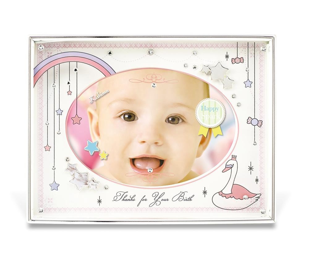 輝く3つ星とレースプリントがポイントの台紙と、甘いお菓子を散りばめたようなキュートなプリントのガラスが2層に重なり、中の写真を上品に彩ります。クラウンをつけたスワン、大きな虹、キャンディなど、夢がいっぱいのキラキラ楽しいフォトフレームです。 |