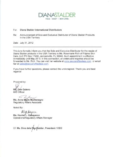 -. LegalDisclaimer : All Diana Stalder products have been approved by the Philippine Bureau of Food and Drugs. Most products have also been registered under the U.S. FDA Voluntary Cosmetic Registration Program (VCRP), however, the products themselves--and claims made about the products--have not been evaluated by the U.S. FDA. These products are not approved to diagnose, treat, cure or prevent any disease. If you have a medical condition or disease, please talk to your doctor P.R.Ior to using these products.