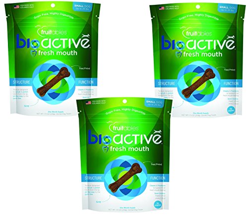 -. Binding : Misc. -. Brand : Fruitables -. EAN : 0895352002945 -. Feature : 3 Packages of Fruitables 15 Count BioActive Fresh Mouth Dental Chews, Small/7.3 oz Each / Made in the USA (with Icelandic sea kelp) / Cleans the entire tooth from the tip to the gum line, A firm scrubbing texture allows tooth to sink into the chew / Organic Icelandic sea kelp with bacteriostatic properties works with saliva to fight bacteria & plaque on the tooth surface / Decaffeinated green tea extract and parsley fights bacteria to freshen breath -. Label : Fruitables -. Manufacturer : Fruitables -. PackageQuantity : 3 -. ProductGroup : Pet Products -. ProductTypeName : PET_SUPPLIES -. Publisher : Fruitables -. Studio : Fruitables -. Title : 3 Pack of Fruitables 15 Count BioActive Fresh Mouth Dental Chews, Small/7.3 oz Each -. UPC : 895352002945