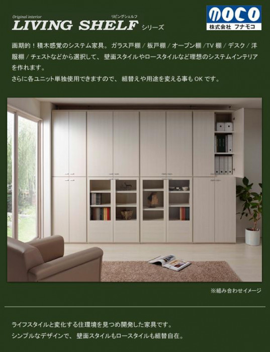 用途に合わせ組み合わせや向きを自由に変える事ができる、ガラス戸の棚です。 |