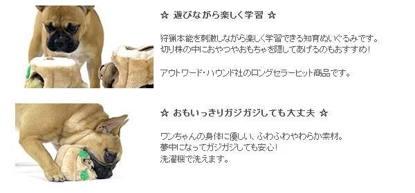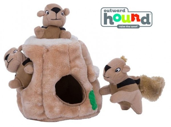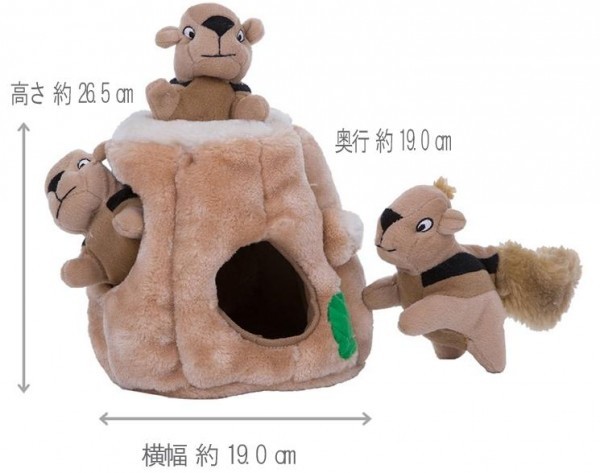 | 切り株の中に隠れたリスを捕まえて遊ぶ、知育ぬいぐるみです。ワンちゃんの狩猟本能を刺激しながら楽しく学習ができるのでアメリカではロングセラーヒット商品。しっかりと作り込まれた丈夫なつくりでありながらワンちゃんの身体に優しいやわらか素材だから夢中でガジガジしても安心。見た目もかわいいのでプレゼントにも最適です。 |