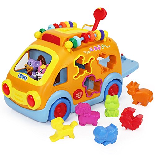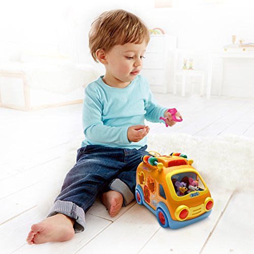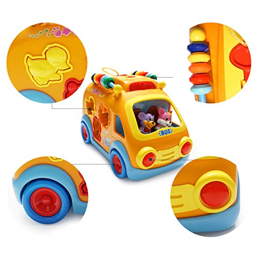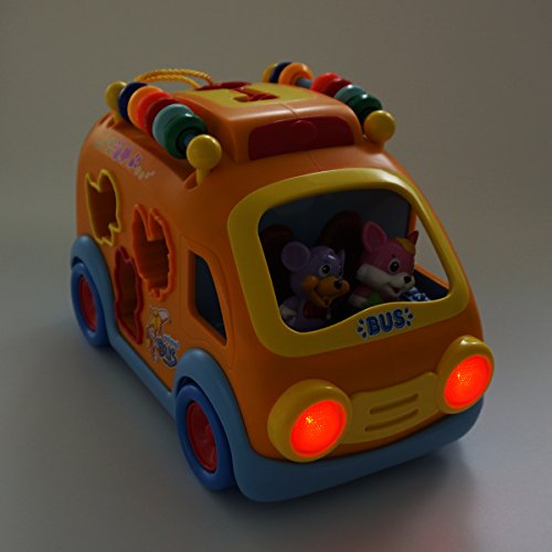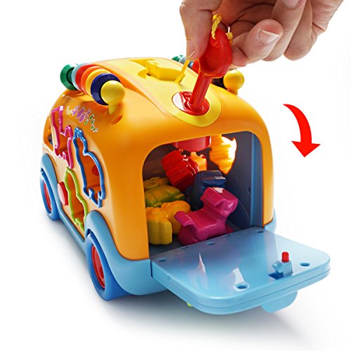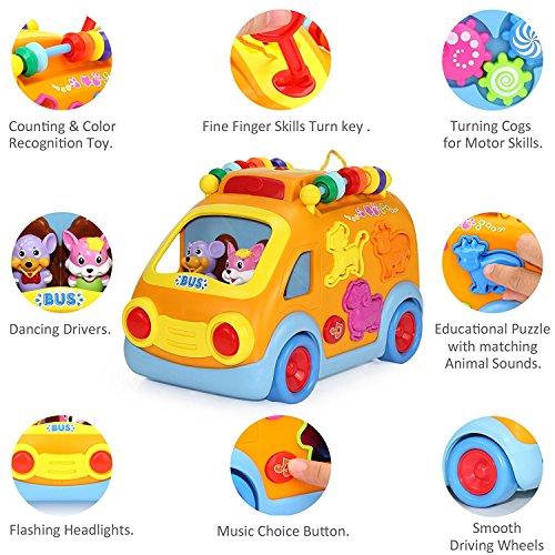 Music button with 8 familiar nursery rhymes and 1 song matching up the bus image. Dynamic music and vivid lyrics help stimulate the baby's language development; Educational key and door help the baby exercise dig, twist, grab, embed, hold and other fine motor skills and cultivate the baby's spatial sense