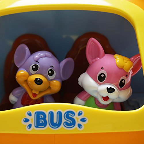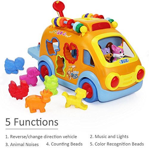 Lifting caster makes this electric bus also a hand push toy, it develops the baby's hand-eye coordination, crawling, chasing and other gross motor skills; Waggling animal driver and flashing lights make the bus driving more dynamic and more realistic.
