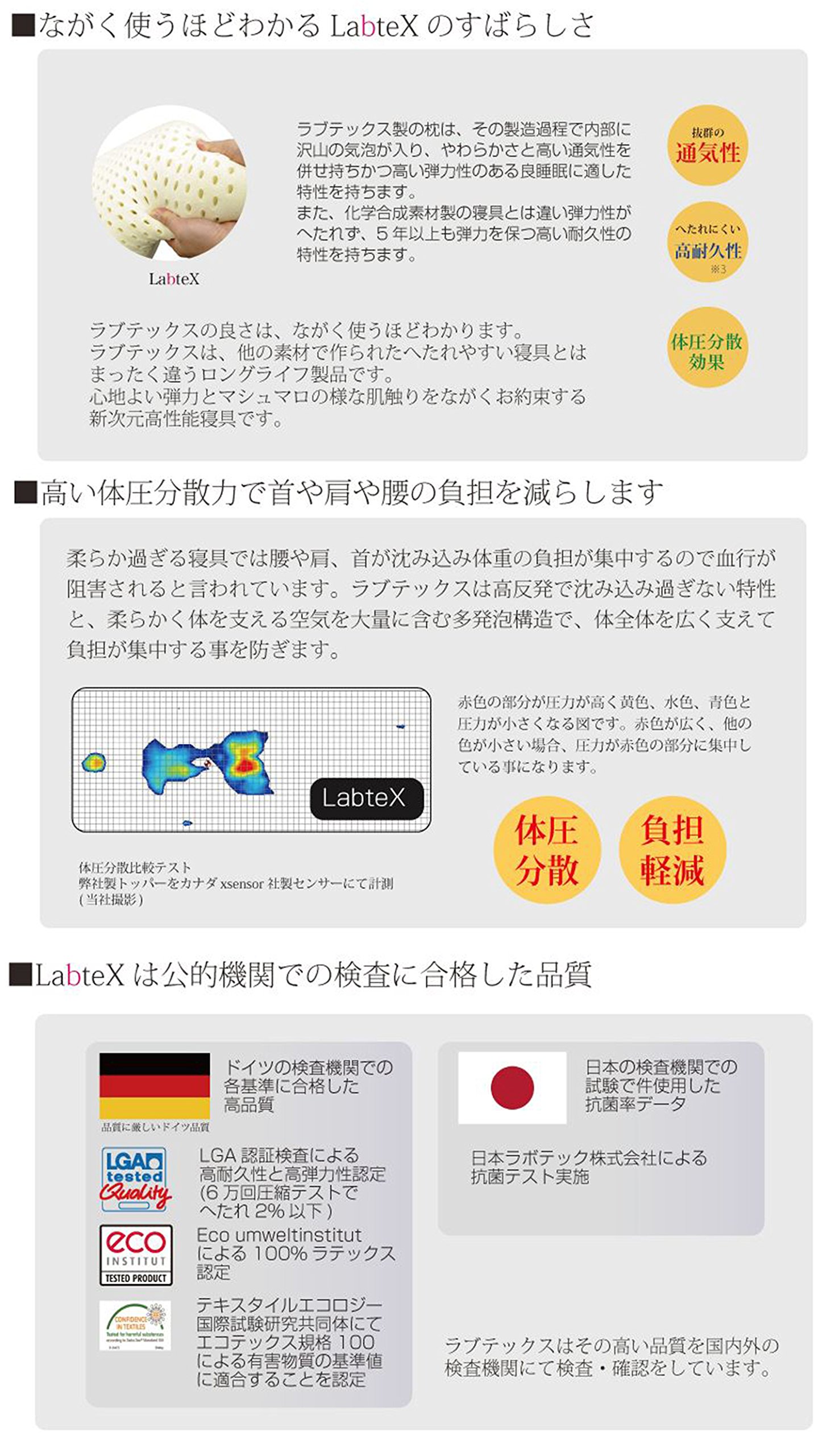 ● Reliable Quality Tested with Public Organizations · · · 100% natural material certified with public institutions in Germany, certification of high durability · high elasticity performance of less than 2% even with 60,000 compression tests,