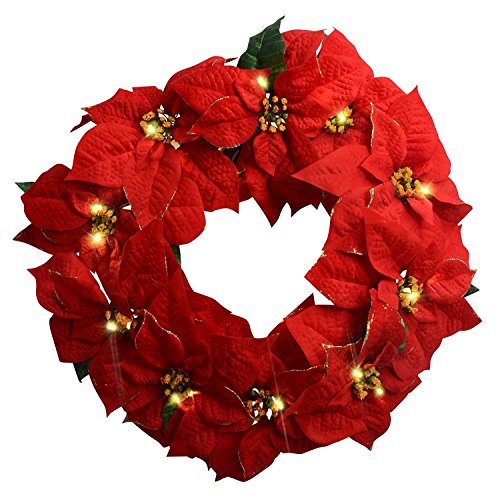 23 Inch Red Poinsettia Lighted Christmas Wreath - Golden Tipped, Battery Operated With Timer Artificial Poinsettia Wreath