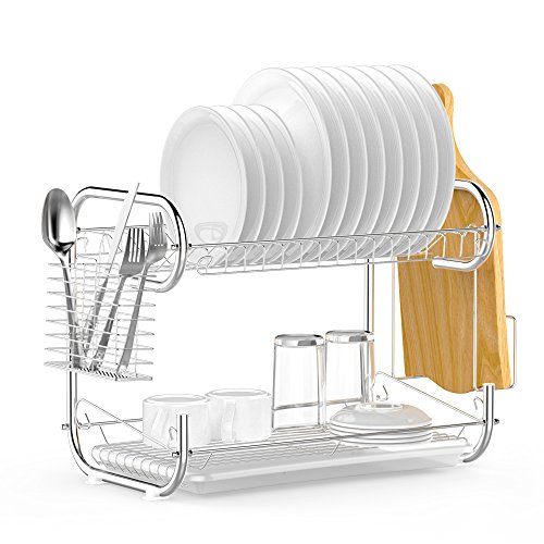 Ace Teah Dish Rack 2-Tier Chrome Plating Rustless Storage Dish Drying Rack and Drainboard Set with Cutlery Rack, Cutting Board Holder for Kitchen Counter