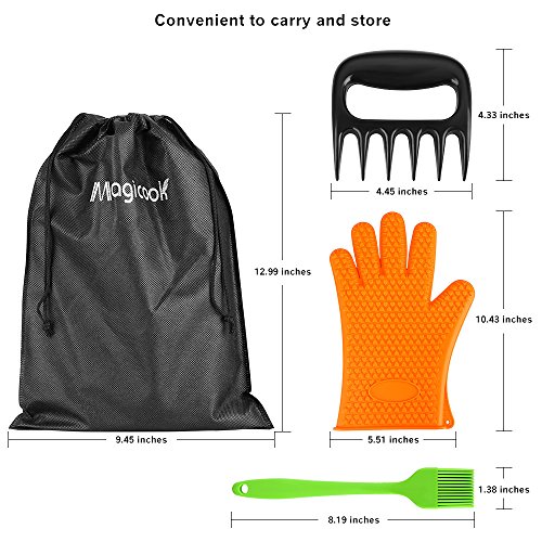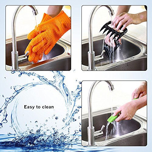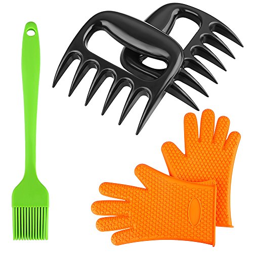 5 in 1 Set- Excellent kit with a pair of heat resistant Waterproof gloves, strong meat claws for bbq pork and handy silicone brush; The food grade silicon is BPA free and certified by FDA; Comes with everything a good griller needs