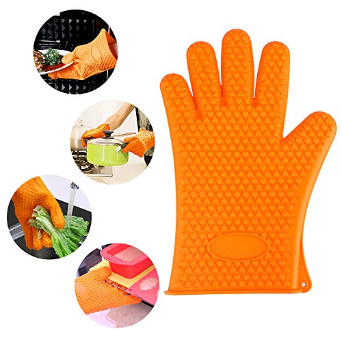 Heat resistant silicone- Protects you from up to 425 degrees fahrenheit No worrying about burning your hands or arms even when you reached deep in the oven or held on the hot food. Cleanup is a breeze