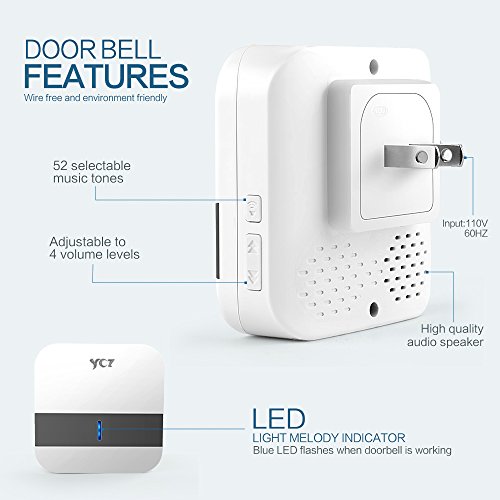 Multiple Volume Option -5 levels of adjustable ringing volume over than 85dB within 0.5m/1.6ft, 52 different chimes and three chime modes: Chime, Flash, Chime & Flash