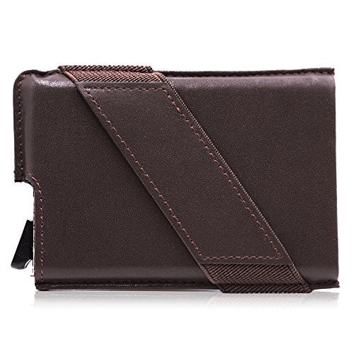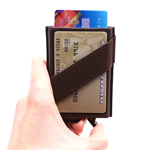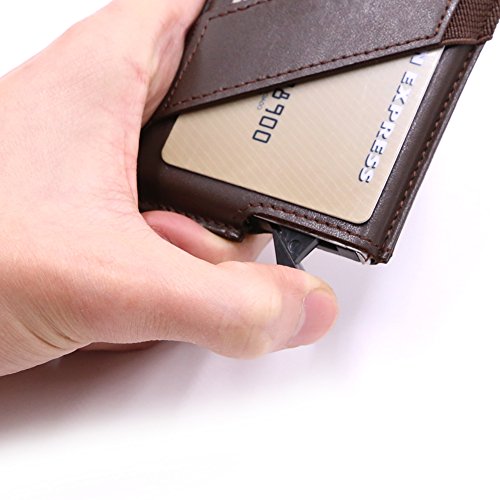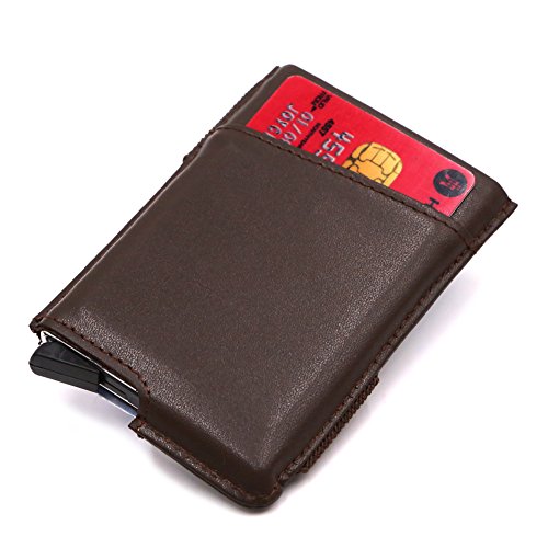 -. Feature : Card Security Protector: The RFID protection card holder can block unwanted RFID scanner, includes RFID blocking technology to prevent unauthorized access to personal information, designed to block RFID readers from scanning your credit cards, debit cards, ID card and other cards. / Smart Design: It's an automatic pop-up card holder. With a lever click, all card can be slide out easily. We have tested many times that cards won't fall out even we swing it with opening side facing down. / Function & Slim: It can store up to 5 credit card size cards or 10 name cards. And you can store some cashes under the elastic band and leather strap and 1 card slot for most used cards outside the case. And it still keeps slim. Size at 3.93 * 2.56 * 0.45 inch. / Light Weight: This Aluminum card case is small and light which is very easy to carry for travelling or work. No problem to keep it in front or back pocket. / Premium Material: Using high quality aluminum and top grain genuine leather. Perfect combination of metal and leather makes it more durable and luxury. Perfect card case wallet for man.