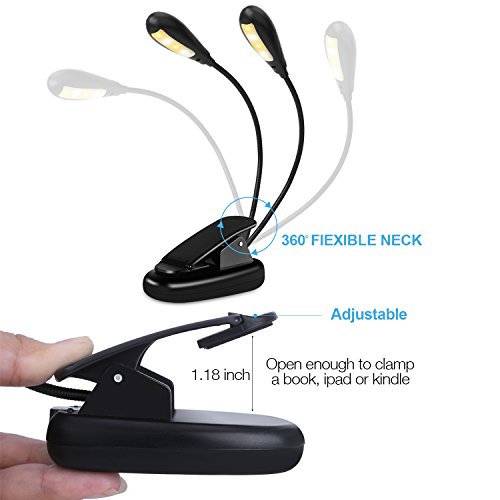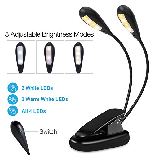 - [ 3 Brightness Settings]: Book light with 2 heads & 8 dimmable LEDs. Press the button on the lampshade to adjust its brightness according to your needs: 1st click to turn on 2 white lights on; 2nd Click to turn on 2 Warm white lights; 3rd click to turn on all 4 lights.
