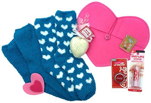 Cozy Bundle of 2 pairs of Thick Fuzzy Socks in Blue with White Hearts and with a Baby Lips Lip Balm, Coca Cola Lip Smacker, Heart Shaped Soap and Pink Felt Envelope