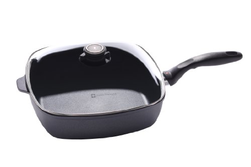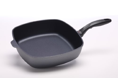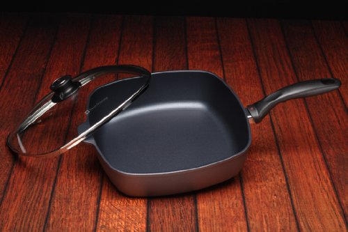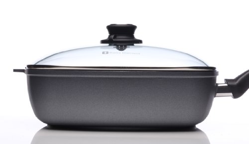 With a unique shape, the Swiss Diamond square saute pan is perfect for sauces, vegetables and meat. Although the pan itself is square, the bottom is round to fit a standard burner, and its cast aluminum construction ensures that even corner areas that do not touch the stove receive equal heat. 11 x 11” Includes lid. The included tempered glass lid allows you to monitor food without lifting the cover, maintaining flavor and keeping food from drying out. The rotating lid knob opens or closes a steam vent to release or contain moisture as needed. Used by discerning home chefs around the world, Swiss Diamond’s PFOA-free cookware features unsurpassed nonstick performance for healthy cooking and easy clean-up. The patented nonstick coating, reinforced with real diamond particles, allows oil-free cooking and cleans up with just warm soapy water. No more scrubbing and soaking! Swiss Diamond’s patented nonstick coating is reinforced with real diamonds for excellent durability and resilience. Why diamonds? Three reasons: they are durable, they are naturally nonstick, and they conduct heat better than any metal. A perfect combination for a lifetime of cooking excellence. Swiss quality is visible in every aspect of Swiss Diamond cookware. Heavy-duty cast aluminum will never warp, while the perfectly flat base distributes heat evenly and will not tip or spin. The rivet-free interior prevents unsightly food build-up that can lead to bacterial growth. The ergonomic handle, designed for comfort and balance, stays cool on the stovetop. All Swiss Diamond products are oven-safe up to 500 degrees F (260 degrees C). Induction model items, like this one, are suitable for all gas, electric and induction cooktops. Made in Switzerland with an eco-friendly production process.Feature