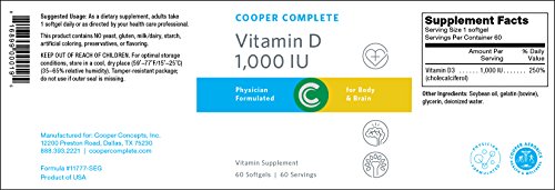 -. Binding : Health and Beauty -. Brand : Cooper Complete -. EAN : 0988565101496 -. Feature : Vitamin D3 1000IU, 2 Bottles, 120 Softgels / Take daily with a meal or as directed by your physician -. IsAdultProduct : 0 -. Label : Cooper Complete -. LegalDisclaimer : These statements have not been evaluated by the Food & Drug Administration. These products are not intended to diagnose, treat, cure or prevent any disease. -. Manufacturer : Cooper Complete -. MPN : A157-P2 -. PackageQuantity : 2 -. PartNumber : A157-P2 -. ProductGroup : Health and Beauty -. ProductTypeName : HEALTH_PERSONAL_CARE -. Publisher : Cooper Complete -. Studio : Cooper Complete -. Title : Cooper Complete Vitamin D 1000 IU 120 CT (2 Bottles) -. UPC : 988565101496