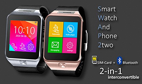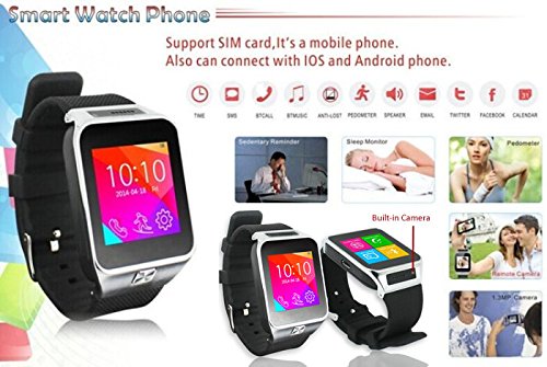 -. Feature : GSM Unlocked phone that can be used from anywhere across the world. works with any gsm wireless carries in the world such as at&t, t-mobile, straightalk, Orange, Vodafone, you name it. You can stick in your GSM micro SIM-card and you can gain instant access to an amazing communication device that works like a cell phone on your wrist. / Connect to your smartphone via Bluetooth and bring all the features to your wrist. After connecting smartphone via Bluetooth, SWAP TWO can make, end, or reject phone call directly without touching your phone. When incoming calls, SWAP TWO will ring or vibrate and show incoming phone number. / SWAP TWO can synchronize phonebook of the smartphone, so contacts can be consulted on the watch instead of the smartphone and you can keep the smartphone in the pocket. Smart Anti-lost - After activating anti-lost function, smart watch will ring or vibrate to alert if the smartphone leaves smart watch 10-20 meters away. / Pedometer - The watch can record walk steps whenever and wherever, view current walk distance, fat and calorie consumption. | Sleep Monitor - Wearing it when you sleep will help you monitor how long you sleep and how good your sleep is, which reminds you of improving your work and sleep schedules. A good sleep makes you energetic and vigorous a whole day. / Built-in Camera (new) | Color Touch Screen | Time Display | Calls (Answer, End, Reject) | Caller ID | Messaging | Notification | Remote Camera Shutter | Music | Phonebook | Anti-lost Alert | Built-in Mic & Speaker | Ringtone & Vibration | Pedometer | Audio Player | FM Radio| Calender | Alarm | Multimedia | Voice Recorder | Image Viewer | Calculator Sleep Monitor | Phone locator |