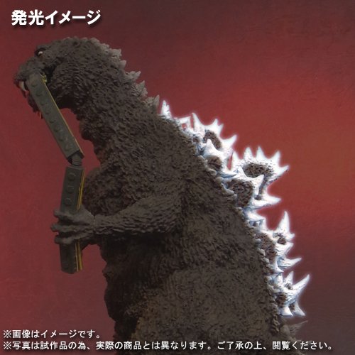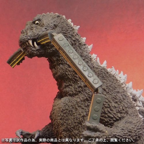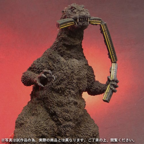【商品内容】 ゴジラ本体・・・1 ゴジラ尻尾・・・1 電車・・・1 台座・・・1 電源ユニット・・・1 取扱説明書・・・1 【電池】 単4乾電池×4本使用(別売り) 【対象年齢】 15才以上 【製品素材】 ゴジラ本体:PVC ゴジラ尻尾:PVC 電車:PVC 台座:PVC 電源ユニット:ABS・PE・PVC 発売元:株式会社プレックス ※写真は製作中のものです。実際の製品は多少異なる場合がございますのでご了承ください。 ※彩色は手作業で行っております。微細な傷、塗りムラ、若干の色味の濃淡などが個々にありますので、予めご了承ください。 ※パッケージは商品の梱包材です。商品輸送の過程で微細な傷、擦れや汚れが発生する場合がございます。 商品自体にダメージがない場合、商品及びパッケージの交換はお受けいたしかねますので予めご了承ください。 TM & ©TOHO CO., LTD. モノクロver.に引き続き、ゴジラ1954(電車咥え)が、 人工着色されたポスターや当時の雰囲気を塗装で再現した、総天然色版として登場! 加えて、背びれには発光ギミックも搭載しております。 ※単4乾電池×4本使用(別売り) また、2017年冬のワンダーフェスティバルでは、 こちらの総天然色版ゴジラの電車カラーが小豆色になったイベント限定品を予定しております。(発光ギミック非搭載) 原型は、仁工房さんと、原型士の大山竜氏とで製作されたもので、 ガレージキットとして発売され好評だったもので、今回、縁あってソフビ完成品にする事が出来ました。 大山竜氏は既成のイメージに囚われず、そのモチーフの内面までも造形する事が作風でもあり、 個性的ともいえる表現で具現化する事で、多くのファンを魅了しています。 この電車を咥えるシーンは、当時の有名な宣伝用スチール写真が元になっています。 そのスチールでは、後方に日劇が見えます。 銀座、有楽町を蹂躙した際に、数奇屋橋を踏み砕き、川の水が氾濫するシーンがありますが、このシーンですね。 また、電車を咥えるシーンは、映像の中では、品川駅を急襲した際、ギニョールを使ってアップで再現されています。 つまり、最も効果的なイマジネーションの完成形がこの作品のモチーフとなっています。 ※この商品は少年リック限定版です。 ※単4乾電池×4本使用(別売り) ※一般小売店ではご購入いただけませんので、ご注意下さい。Feature