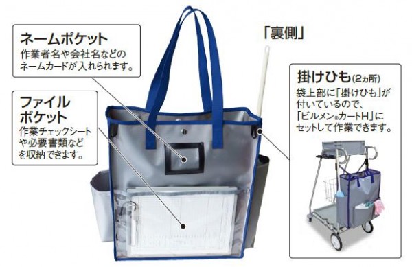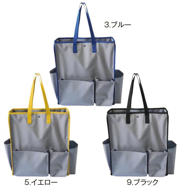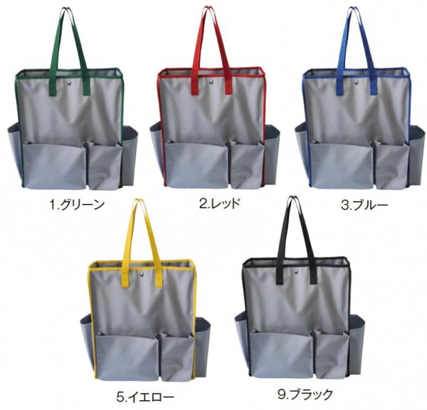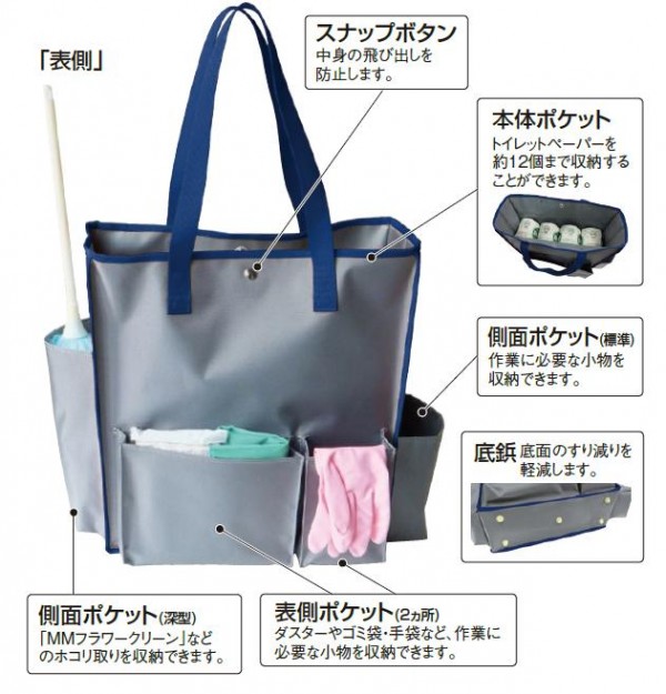 トイレットペーパー約12個分収納できる、たっぷり入る清掃用カバンです。清掃時に必要な道具が楽に運べて、清掃時も邪魔になりません。5色のカラーバリエーションで、作業場所や使用用途などの分類にも役立ちます。 |