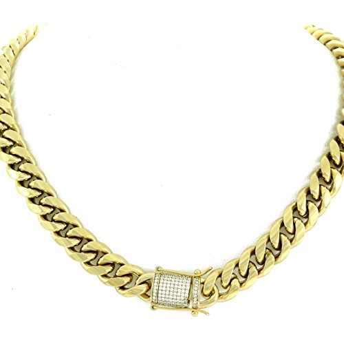 -. Feature : 14mm Miami Cuban Link Chain. Solid and heavy! 200 Grams! 100 Micropave Hand-Set VVS Lab Diamonds In Clasp - 1ct TW / 5X ELECTROPLATED WONT CHANGE COLOR -14k Gold Over Stainless Steel! Hypoallergenic: 100% safe to wear as it is lead free and nickel free; never worry about turning your neck green. / Never fades color... Chlorine pool and saltwater safe! WILL LAST FOR YEARS! / SATISFACTION GUARANTEED!