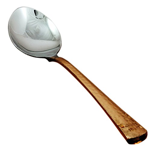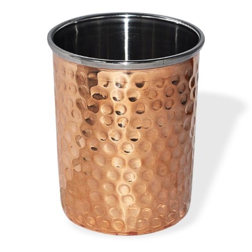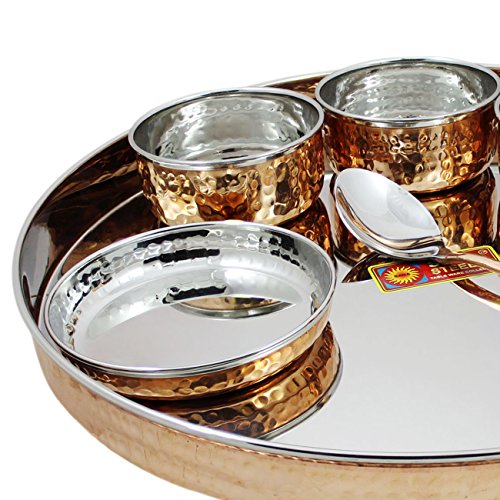 This is a dinnerware thali plate set consists of 1 plate (Thali), 3 bowls, 1 tumbler, 1 dessert spoon, 1 Sweet dish, 1 fork and 1 knife. In India, most of their dishes are served simultaneously in a thali. A thali is a round platter with an eared rim. Entire meals can be served using this simple plate. The thali is generally made with steel or copper. Other dishes served on a thali include vegetables, yogurt, chutney, and pickles. In restaurants, vegetarian or meat-based thalis can be served. Thali is delightful ways to enjoy Indian cuisine. It serves a balanced meal in itself and the flavors are so well rounded that palates will certainly be satisfied. Care Tips:- Clean your copperware by hand and avoid dishwasher as the detergent can cause oxidation leading to permanent damage. Use a solution of equal quantities vinegar or lemon juice and salt diluted with some water at such times but don't use it regularly. Also avoid scratchy cleaners like steel wool. A simple, soft cleaning liquid on soap base, hot water and a soft washing cloth is best for daily use.Feature