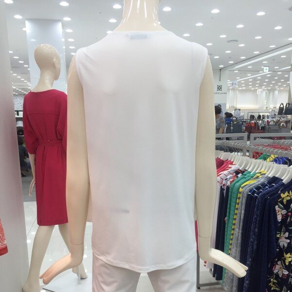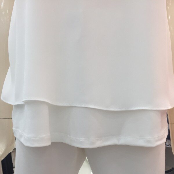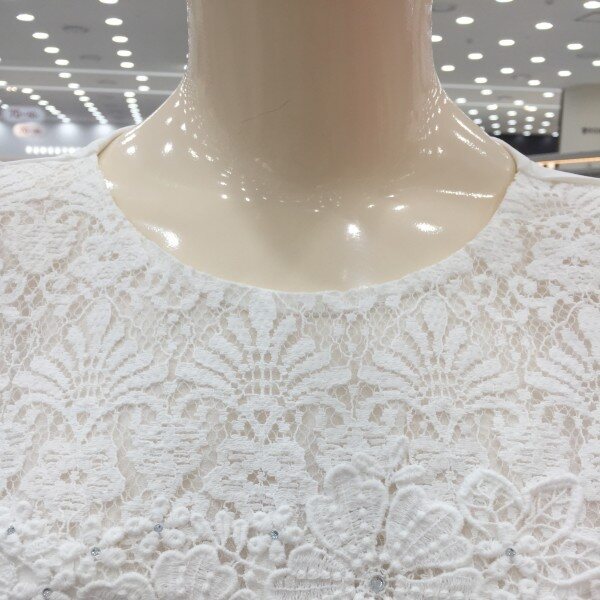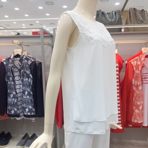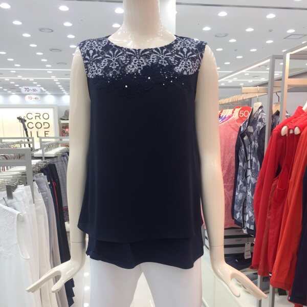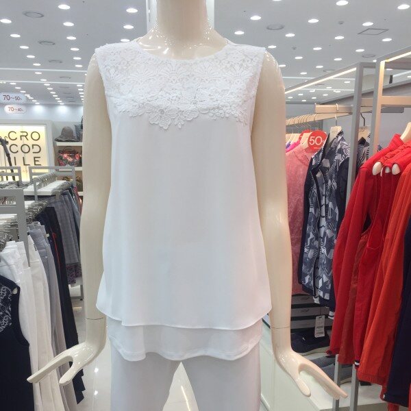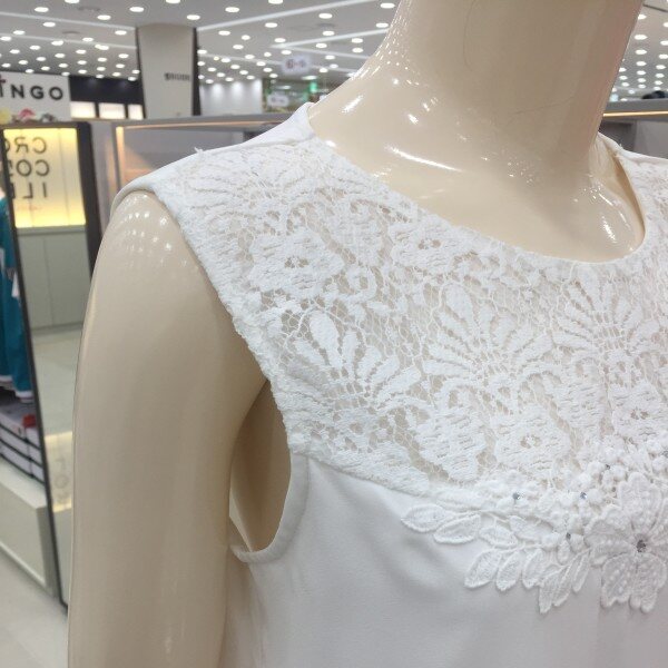 레이스 배색과 모티브가 여성스러움을 주었고 앞판 덧장이 체형 커버에 용이한 아이템.