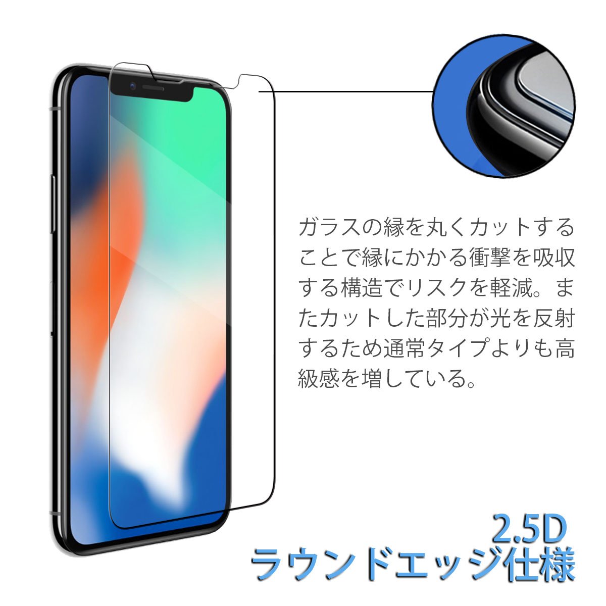 "2.5D Round Edge New Design" By cutting round the edges of the glass, the risk of cracking from the side is lowered by absorbing the shock applied to the edge.