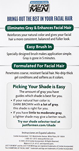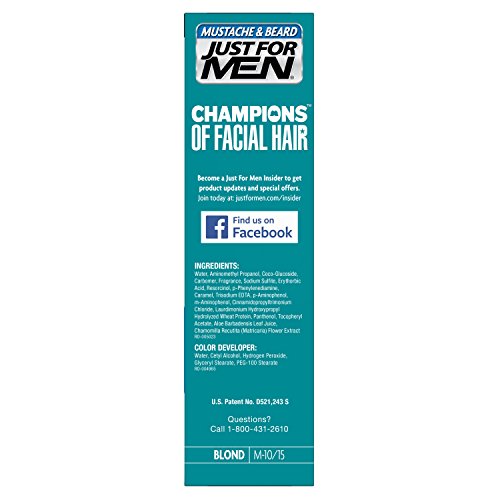 -. Binding : Health and Beauty -. Brand : Just for Men -. Color : Real Black -. Feature : Easy as shampooing. / Lasts up to 6 weeks until the gray grows back. / From the world's leader in men's haircolor. / Targets only the gray -. Label : Just for Men -. Manufacturer : Just for Men -. PackageQuantity : 1 -. ProductGroup : Beauty -. ProductTypeName : BEAUTY -. Publisher : Just for Men -. Size : 2 Pack -. Studio : Just for Men -. Title : Just For Men Mustache and Beard Brush-In Color Gel, Blond