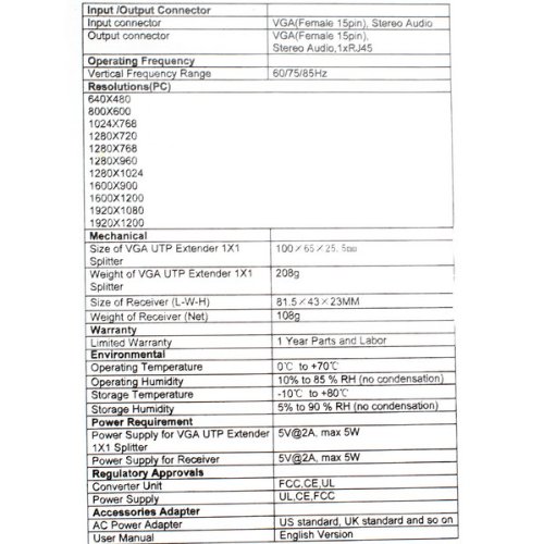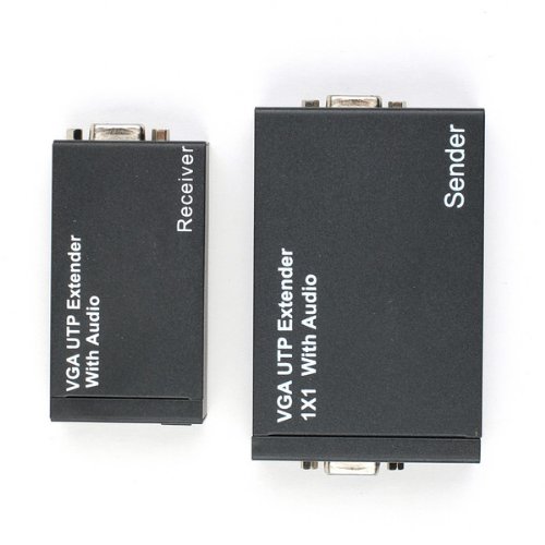 - Feature : Extend VGA video and stereo audio signal max up to 300m over one UTP cat5e/6 cable / Adjusting GAIN and to adapt for the different length of UTP cable: GAIN: Brightness adjustment; Skew adjustment. / Support resolution max up to 1920x1200. / Dual output at local unit: 1 x VGA output for local site, plus 1 x UTP output for remote site. / Work with monitors projectors, HDTV, and flat panels.