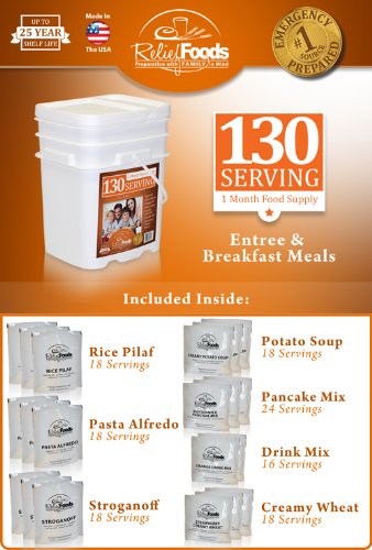 Relief Foods 130 Serving, 1 Month Emergency Food Supply Bucket, is our most popular and best selling emergency food bucket. Packed in strong oxygen resistant Mylar pouches, these 7 different entrée and breakfast menu items are among our top selling food items. Complete with Rice Pilaf, Pasta Alfredo, Stroganoff, Potato Soup, Orange Drink, Pancake Mix, and Strawberry Creamy Wheat meals this bucket is one of our most nutritionally packed and tasteful options. We have done the work of putting together the perfect 1 month food supply, so that all you have to do is decide on how many buckets you need to feel secure. With up to a 25 year shelf life you can feel comfortable knowing you have the value leader in your home for many years to come. A product and a company built with family in mind, this 1 Month Emergency Food Supply bucket shows why Relief Foods is a Value Leader in this industry.Feature