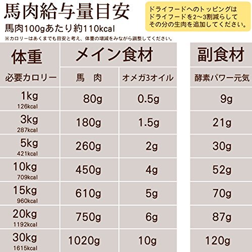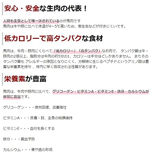 原材料:馬肉 保証分析値(100g中) カロリー:110kcal、タンパク質:20g、脂質:2.5g、ビタミンB2:0.24mg、鉄分:4.3mg、カルシウム:11mg、