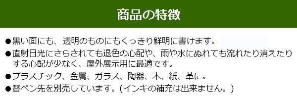 | 黒い面にも、透明のものにもくっきり鮮明に書くことができます。直射日光にさらされての退色や、雨や水にぬれて流れたり消えたりする心配が少なく、屋外展示用に最適です。プラスチック、金属、ガラス、陶器、木、紙、革に使えます。 |