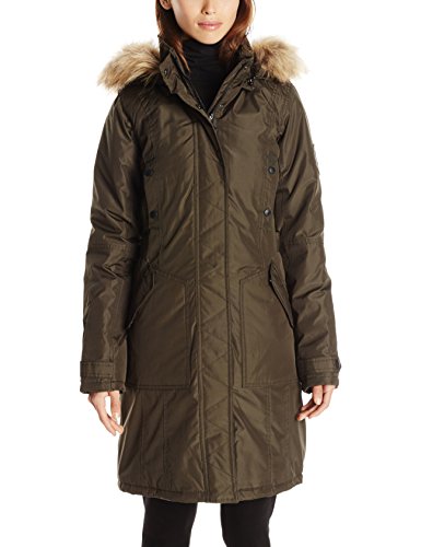 Elongated parka-style coat featuring water- and windproof poly-filled shell with adjustable waist tabs, snap vents at back hem, and removable faux fur-trimmed hood