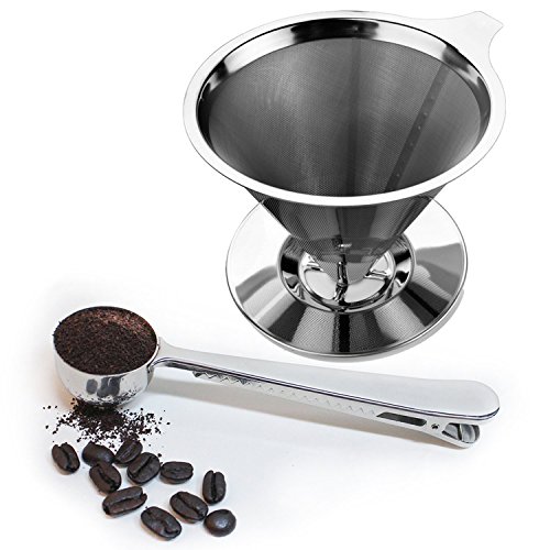 Coffee Dripper, Peyou Stainless Steel Pour Over Coffee Dripper, Reusable Double Layer Mesh Filter Design, Single Cup Coffee Maker For Ease of Use + Bonus Coffee Scoop With Bag Clip