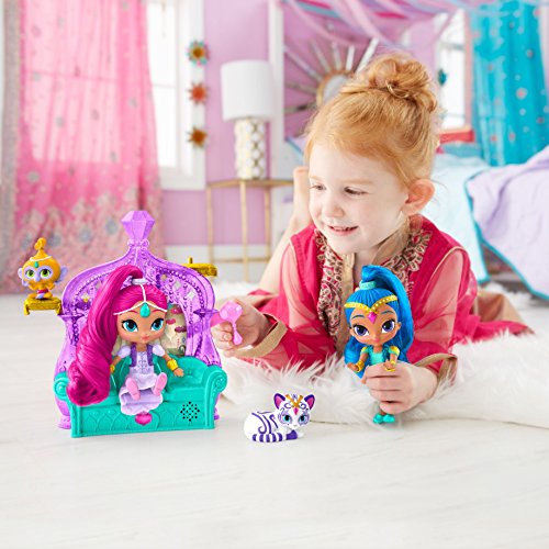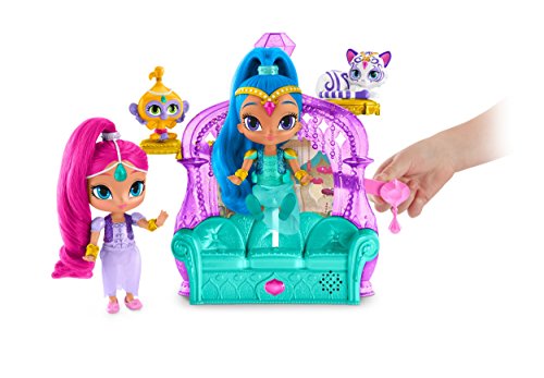 [Description] Place Shimmer or Shine on the couch and press the gem to see one of them magically ``float`` Press the gem on the front of the playset for phrases and a song Shimmer and Shine are each approximately 15.2 cm (6 in) and come dressed in fabric skirts and glittery vests Tala and Nahal can sit on the side pillows Perfect addition or beginning to any Shimmer and Shine collection