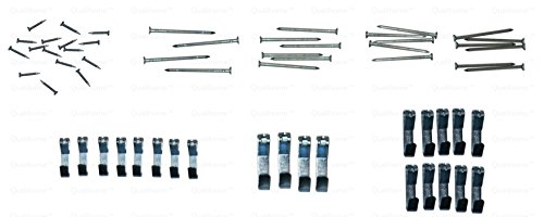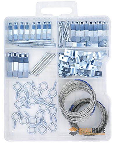 Kit includes: 2 Coil of picture wire, 4 Large Picture hooks, 8 Saw tooth hangers, 8 Small Picture hooks, 10 Medium picture hooks, 18 Screw eyes, 20 picture hanging nails