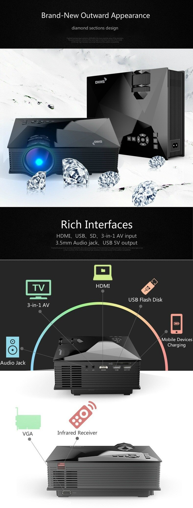 • Beside WiFi display by UNi-Link OS, also can watch programs with bigger screen via VGA / HDMI / USB / SD card, connect PC / laptop to enjoy videos or movies