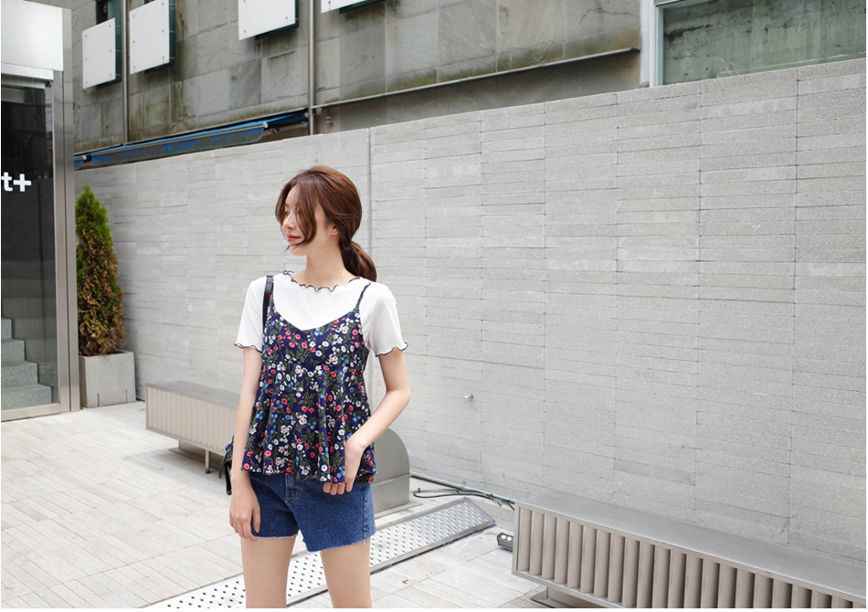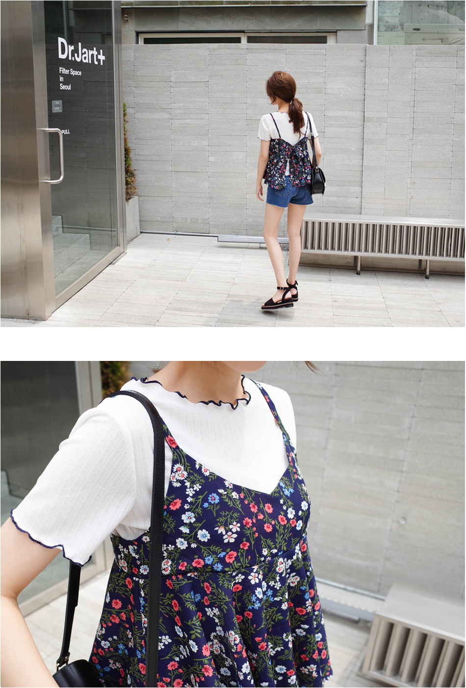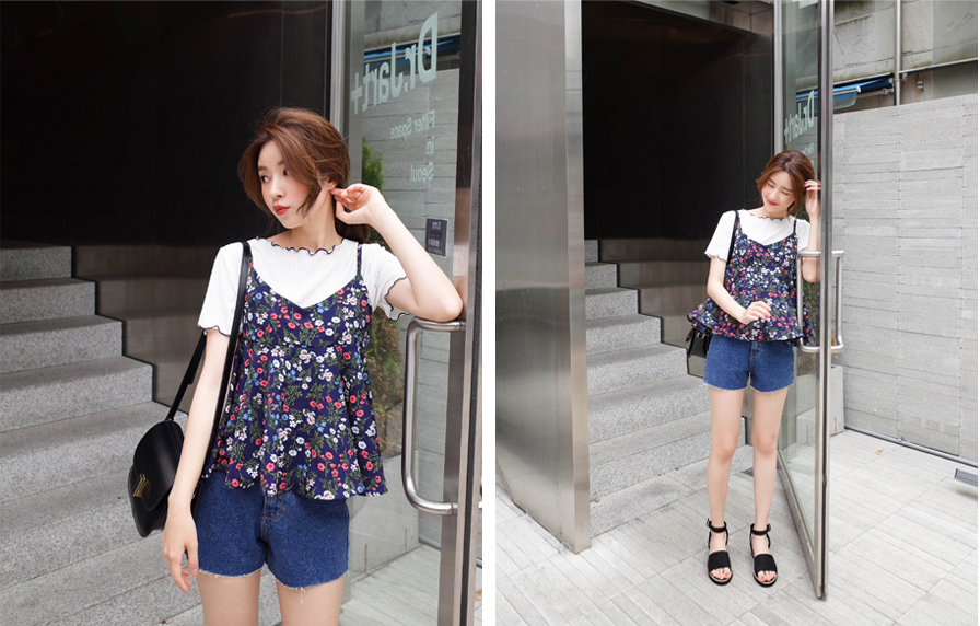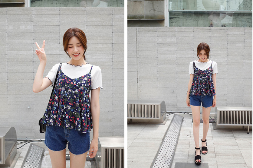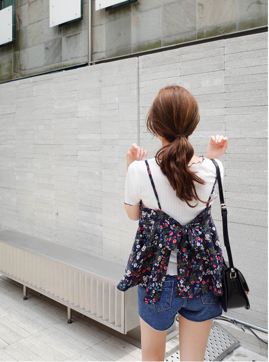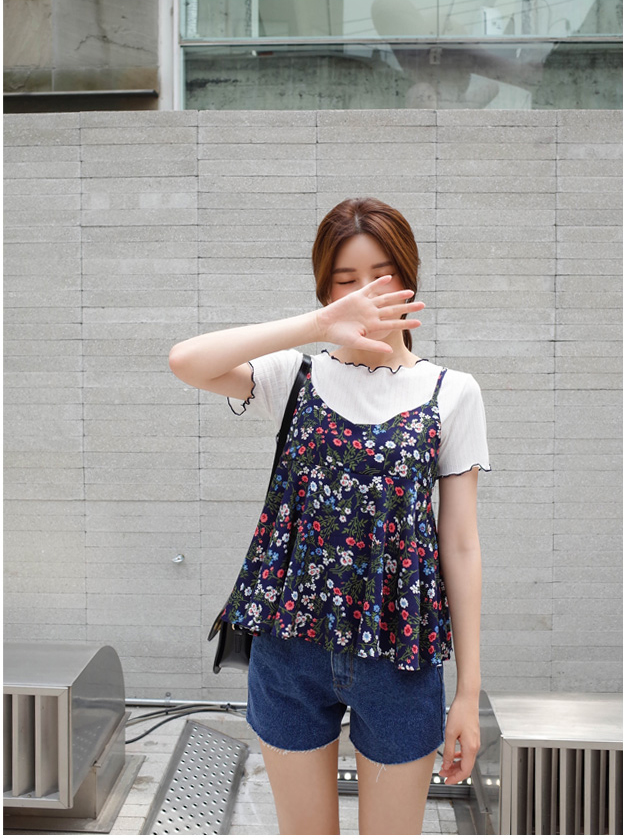 ビスチェはネイビーの生地に花柄がポイントで、ガーリーなコーデを完成させます。