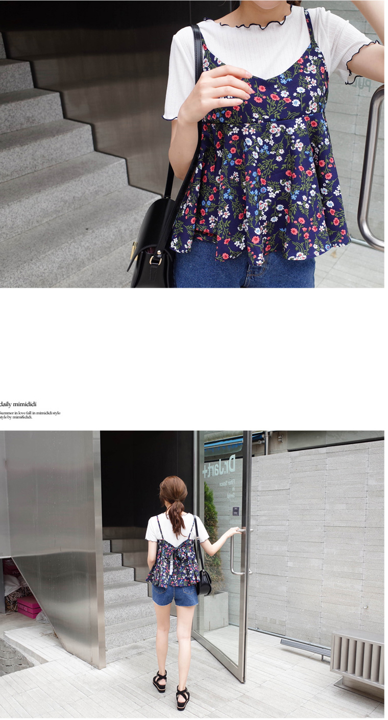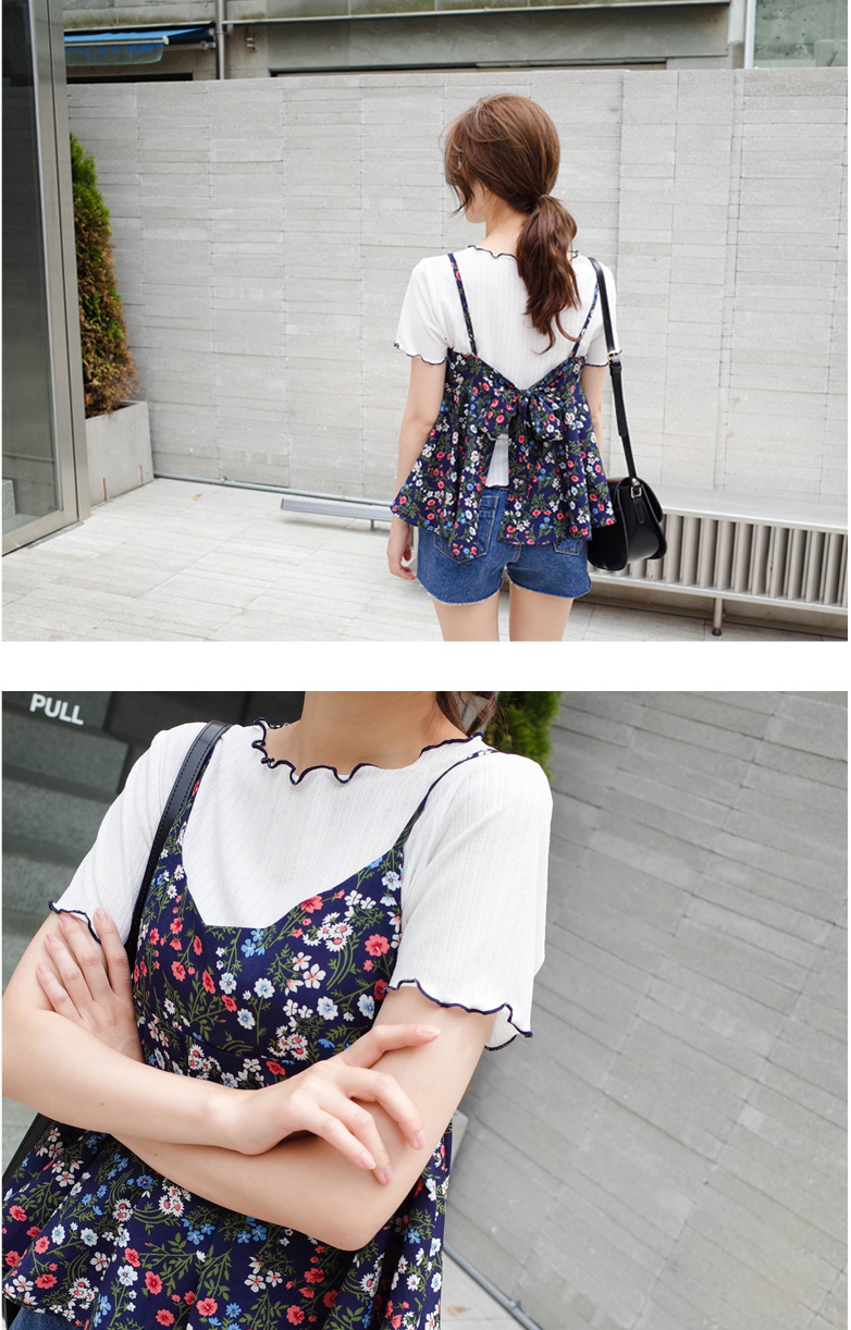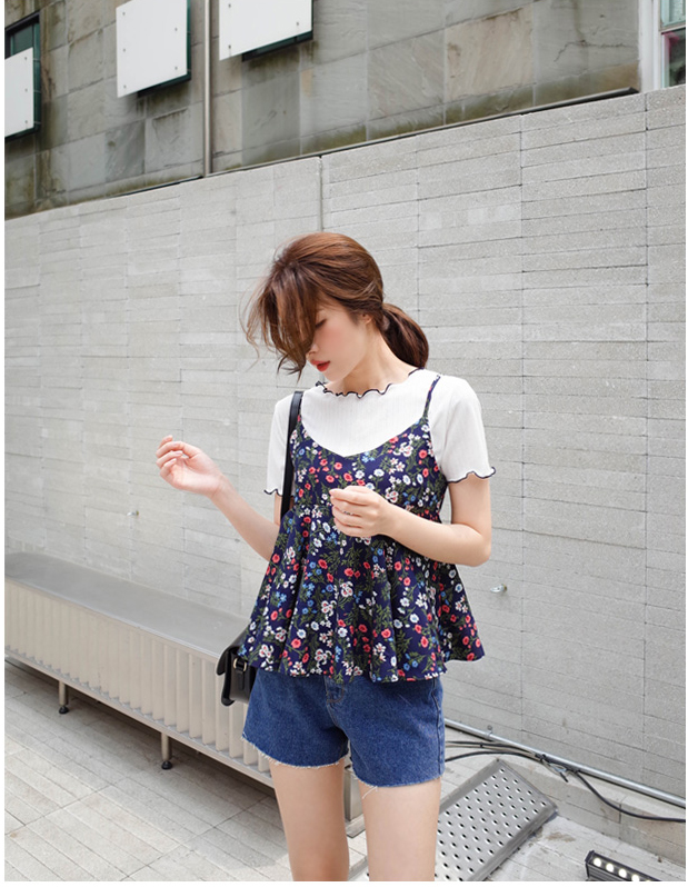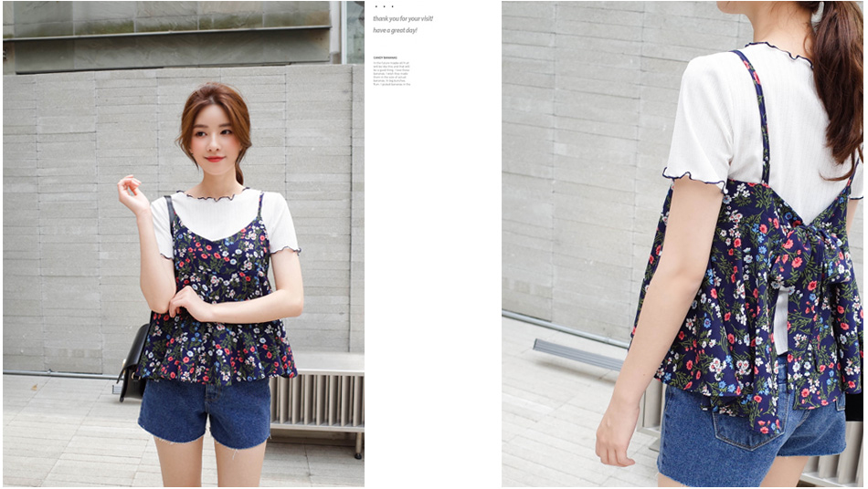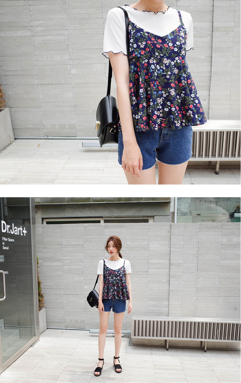 ビスチェはネイビーの生地に花柄がポイントで、ガーリーなコーデを完成させます。