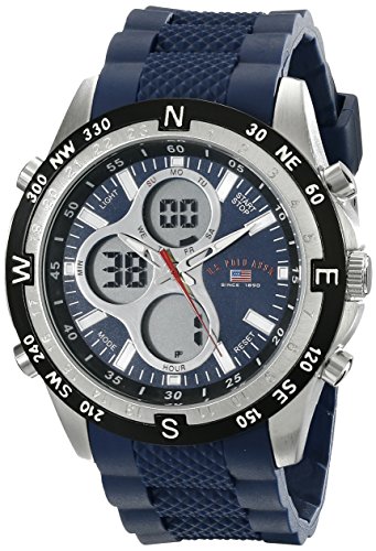 -. Feature : Combining a great look with handy functionality, U.S. Polo Assn. Men's assures you of easygoing style any day of the week. / Quartz movement with analog and digital display / Glass dial window / Features include easy-to-read analog-digital display, 46mm case, buckle closure, blue silicone strap, daily alarm, timer, backlight, chronograph