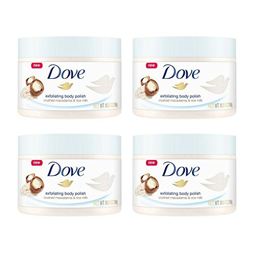 Scrubbing, sloughing, buffing: renewing skin doesnt have to be as rough as it sometimes sounds. Polish your way to smooth, soft skin with something different Dove Exfoliating Body Polish Crushed Macadamia & Rice Milk. Created with moisturizing cream, this nourishing body polish cares for your skin as it exfoliates. Removing dull, dry skin from the surface, it leaves your skin feeling silky and smooth. Restore your skins nutrients and indulge in this body exfoliators rich, whipped texture that gives you a beautifully creamy coverage in the shower. And enjoy the velvety fragrance of crushed macadamia and rice milk as it fills your shower. Say goodbye to dull, dry skin and hello to a rich, relaxing fragrance and skin you cant help but touch.Feature