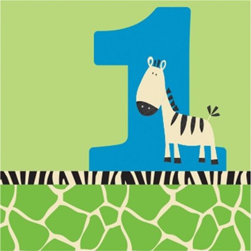 - Beverage napkins in blue and green wild at one print with baby zebra
