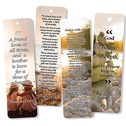 Great variety of bookmarks. We have 6 bookmark designs that you can choose from. 6 unique Christian bookmarks with popular and inspirational Bible verses. Inspirational words are quoted from the following bible texts: Proverbs 17: 17-22 Psalms 46:1-7 Psalms 55:16-23 John 14:25-27 1 John 5:13-17 Romans 15:9-13